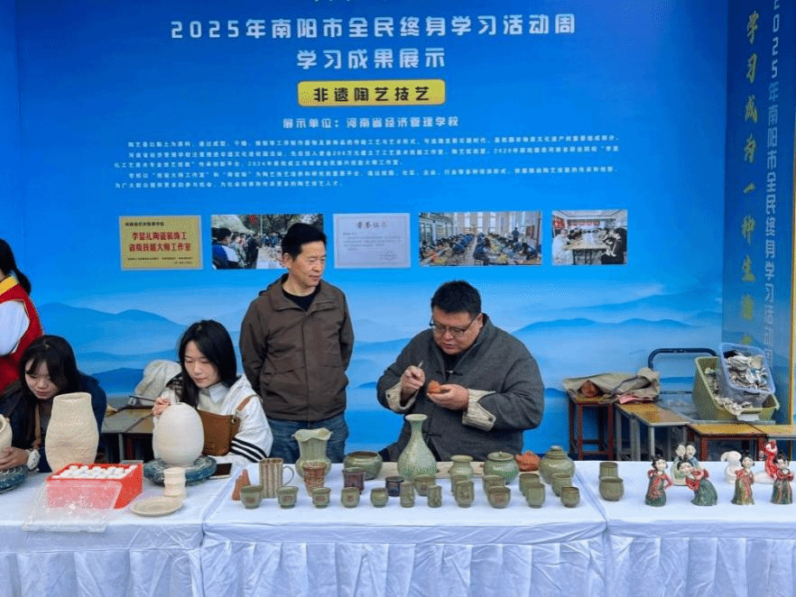 11月13日上午,我校艺术设计系代表学校前往南阳开放大学参加2025年南阳市全民终身学习活动周学习成果展示,参展项目为非遗陶艺技艺。副市长阿颖,市政协副主席、市教育局党组书记、局长杨文普等出席了本次活动。