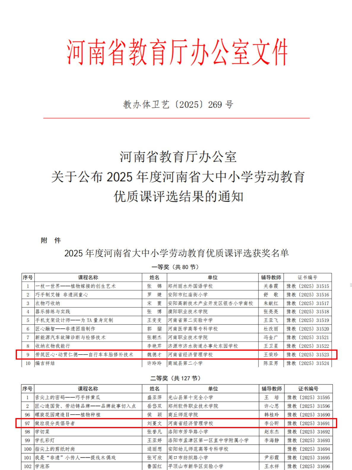 近日,河南省教育厅公布了2025年度河南省大中小学劳动教育优质课评选结果,我校教师魏德才荣获一等奖,刘蔓文荣获二等奖,充分彰显了我校创新劳动教育教学改革方面的积极成效。
