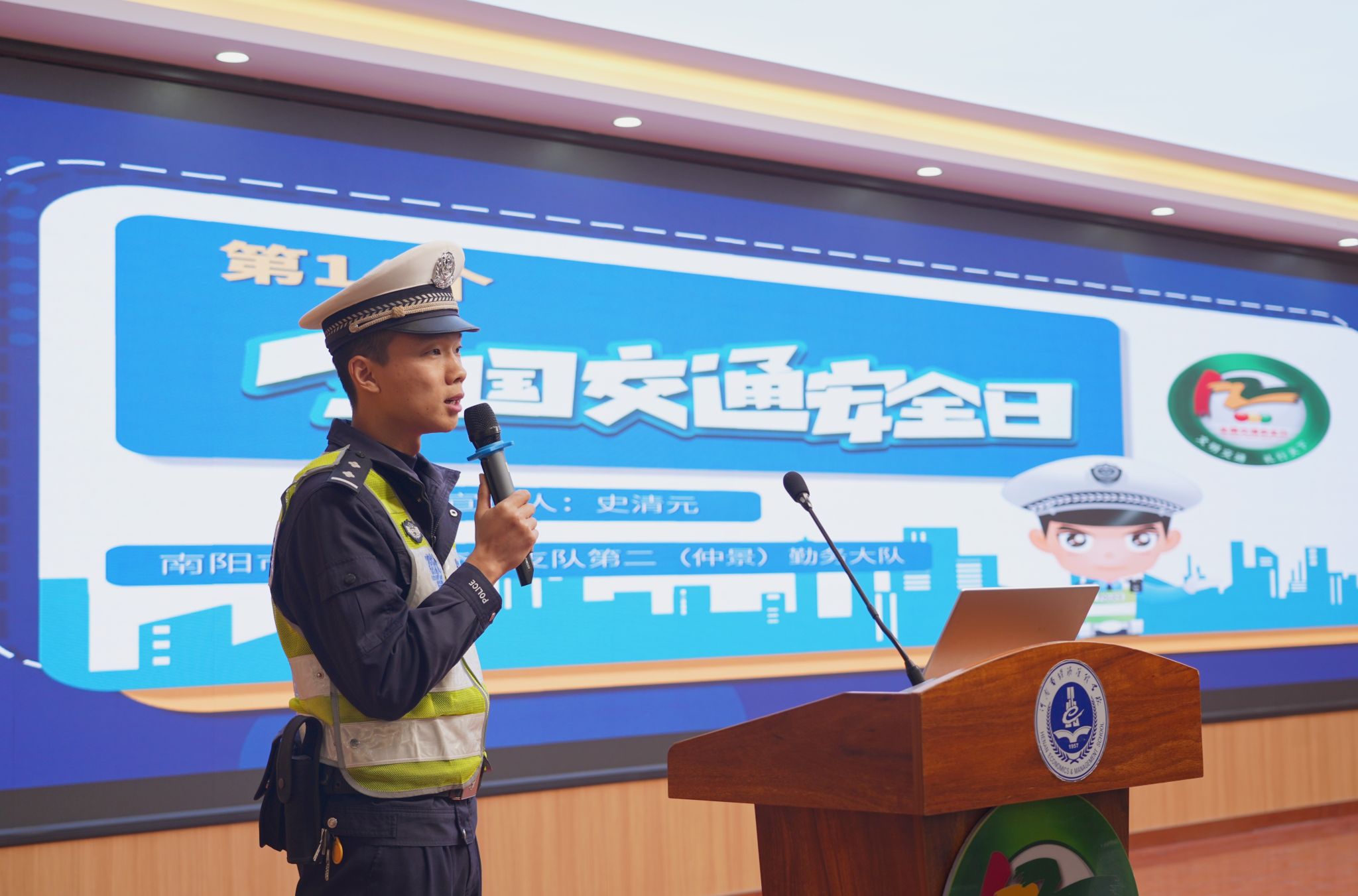 为切实加强校园交通安全宣传教育,进一步增强学生交通安全意识与自我保护能力,有效预防和减少道路交通事故,12月3日,我校在求诚楼学术报告厅开展“文明交通 礼行天下”主题宣讲活动。活动特邀南阳市交警支队第二勤务大队民警张敬良、史清元,为全校师生带来一堂生动的交通安全教育课。
