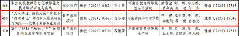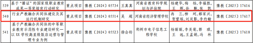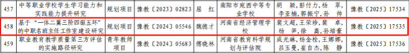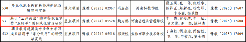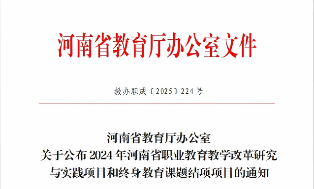 近日,河南省教育厅办公室公布了2024年河南省职业教育教学改革研究与实践项目和终身教育课题结项验收结果,我校申请结项的5项课题全部通过省教育厅复评(其中重点项目2项),充分展现了我校教师团队扎实的教科研实力。