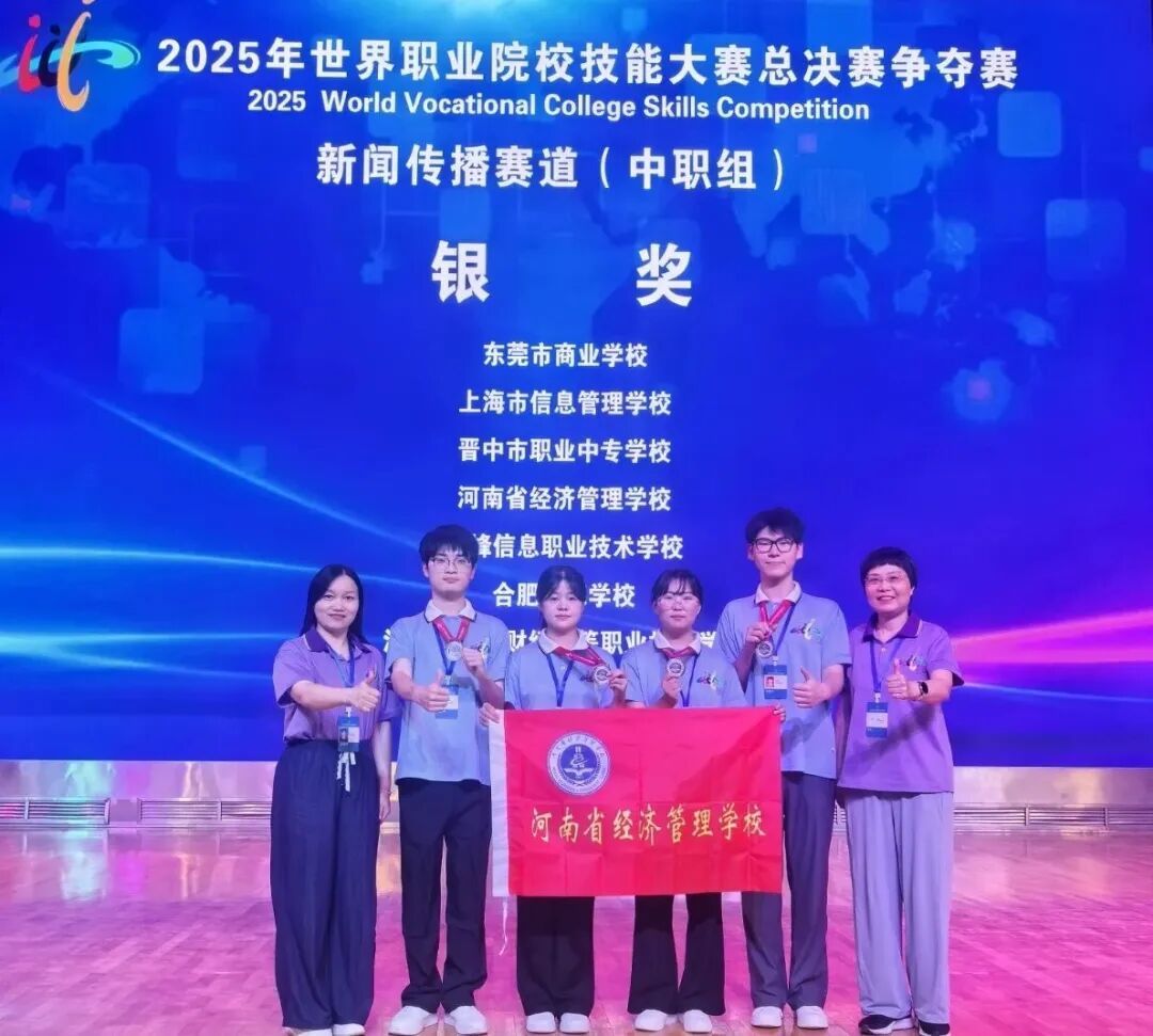 8月29日,2025年世界职业院校技能大赛总决赛争夺赛新闻传播赛道(中职组)在宁夏中卫市职业技术学校落下帷幕。我校信息技术系学生沈茁、郭俊源、李怡楠、周京儒组成的代表队,凭借扎实的技术功底,从全国70支参赛队伍中脱颖而出,以小组第二名的成绩荣获该赛道银奖。